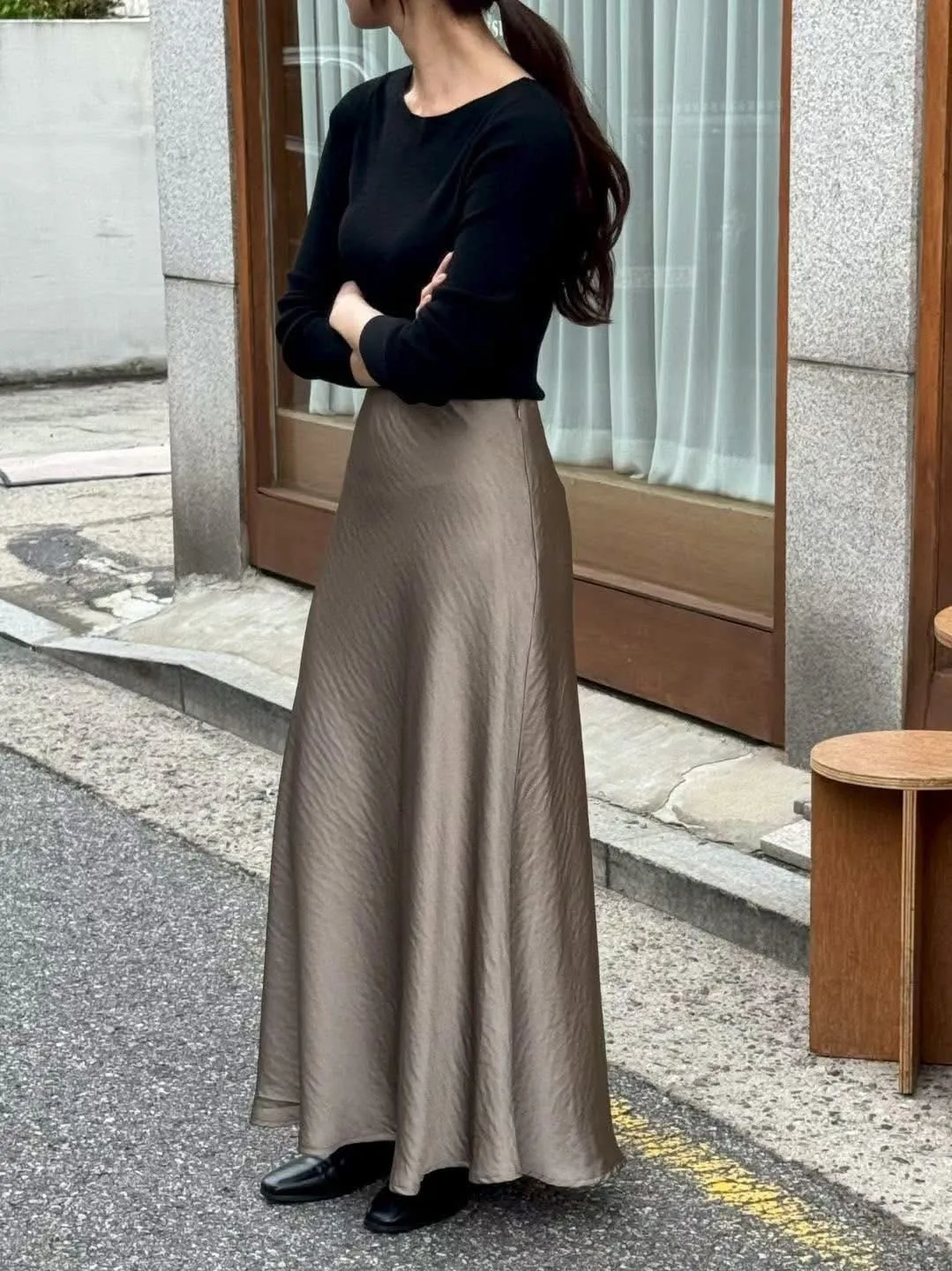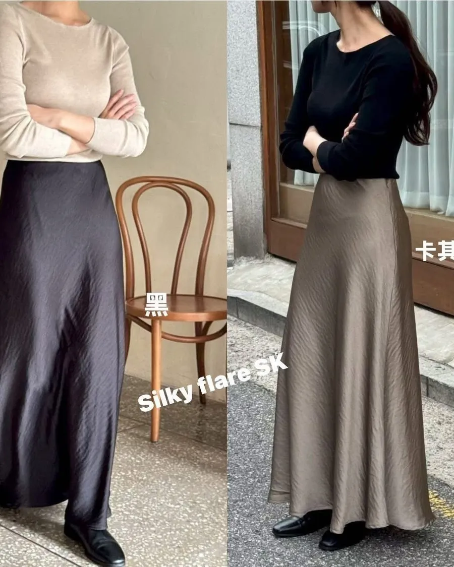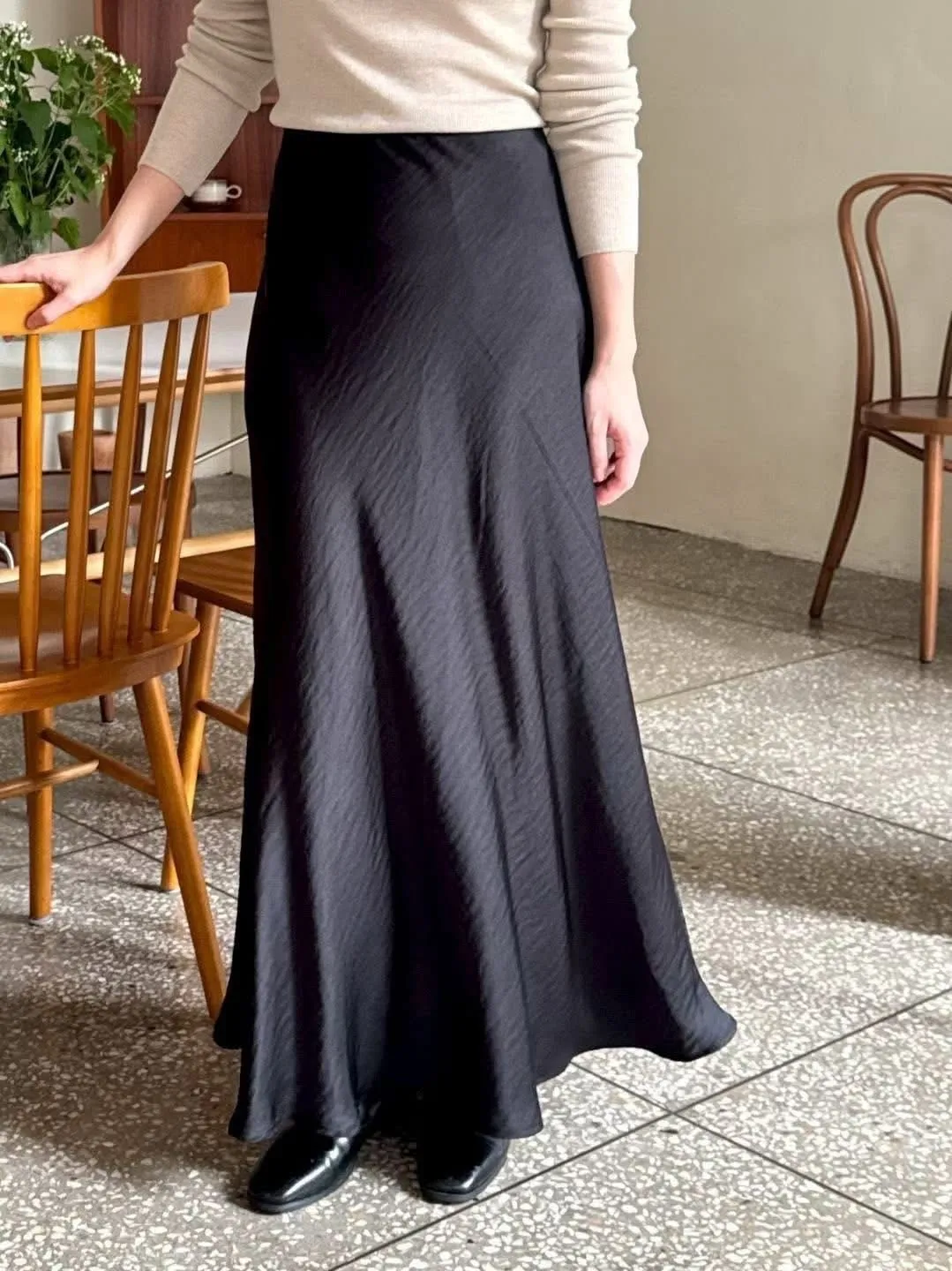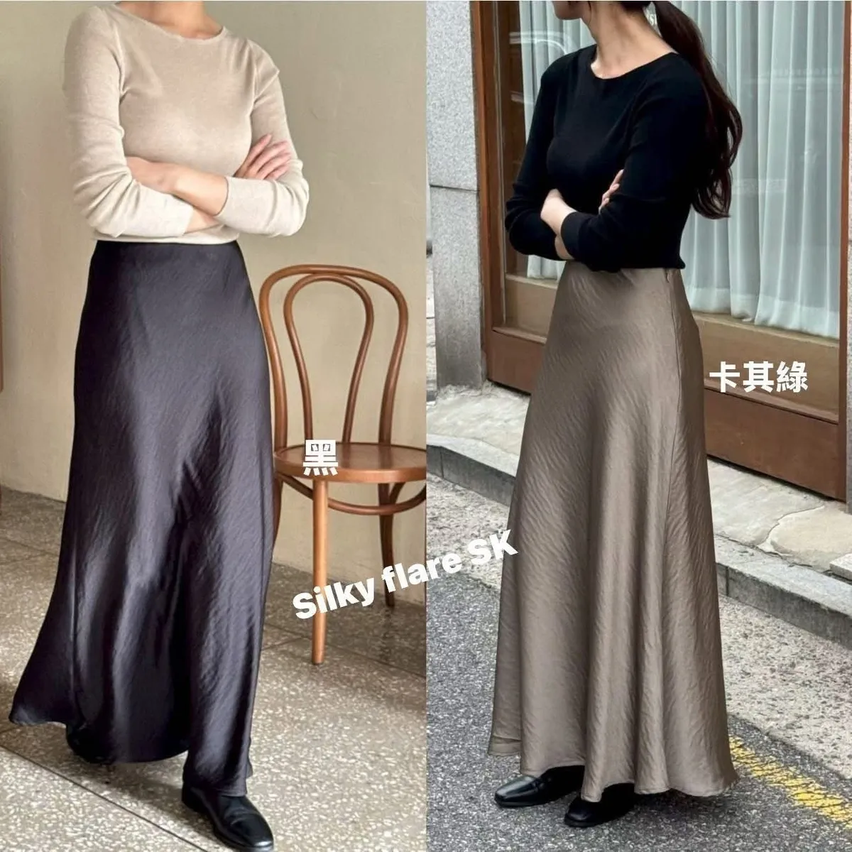 Silky flare SK緞面彈性A line裙 A line版型剪裁的長裙再配上貴氣的緞面材質舒服彈性的腰圍設計好穿又典雅的氣質單品尺寸free sizeL尺寸以下都可以穿#模特兒為S號身材#空媽現在為XL身材168/70可以穿