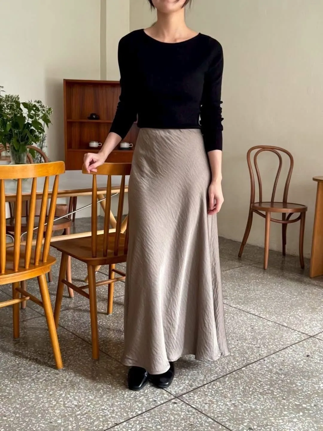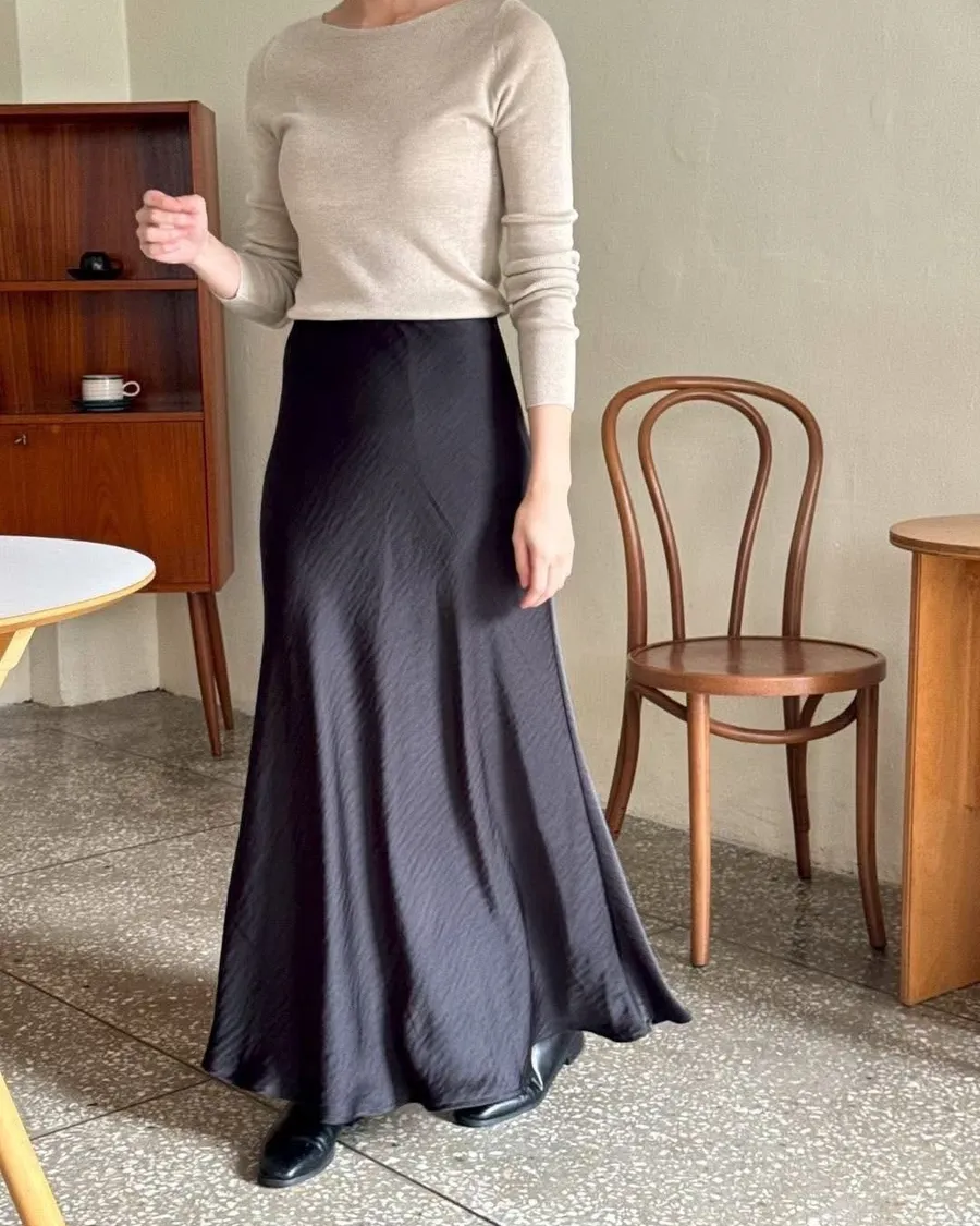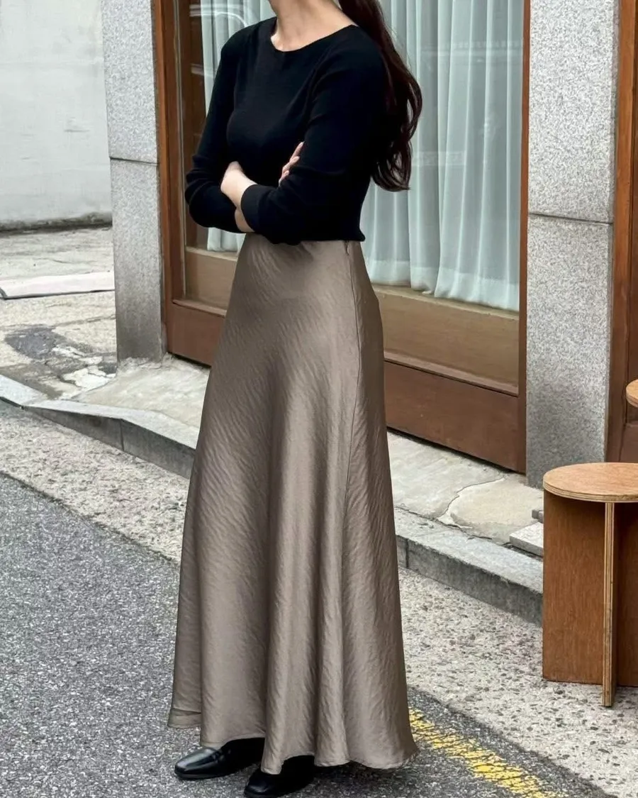 Silky flare SK緞面彈性A line裙 A line版型剪裁的長裙再配上貴氣的緞面材質舒服彈性的腰圍設計好穿又典雅的氣質單品尺寸free sizeL尺寸以下都可以穿#模特兒為S號身材#空媽現在為XL身材168/70可以穿