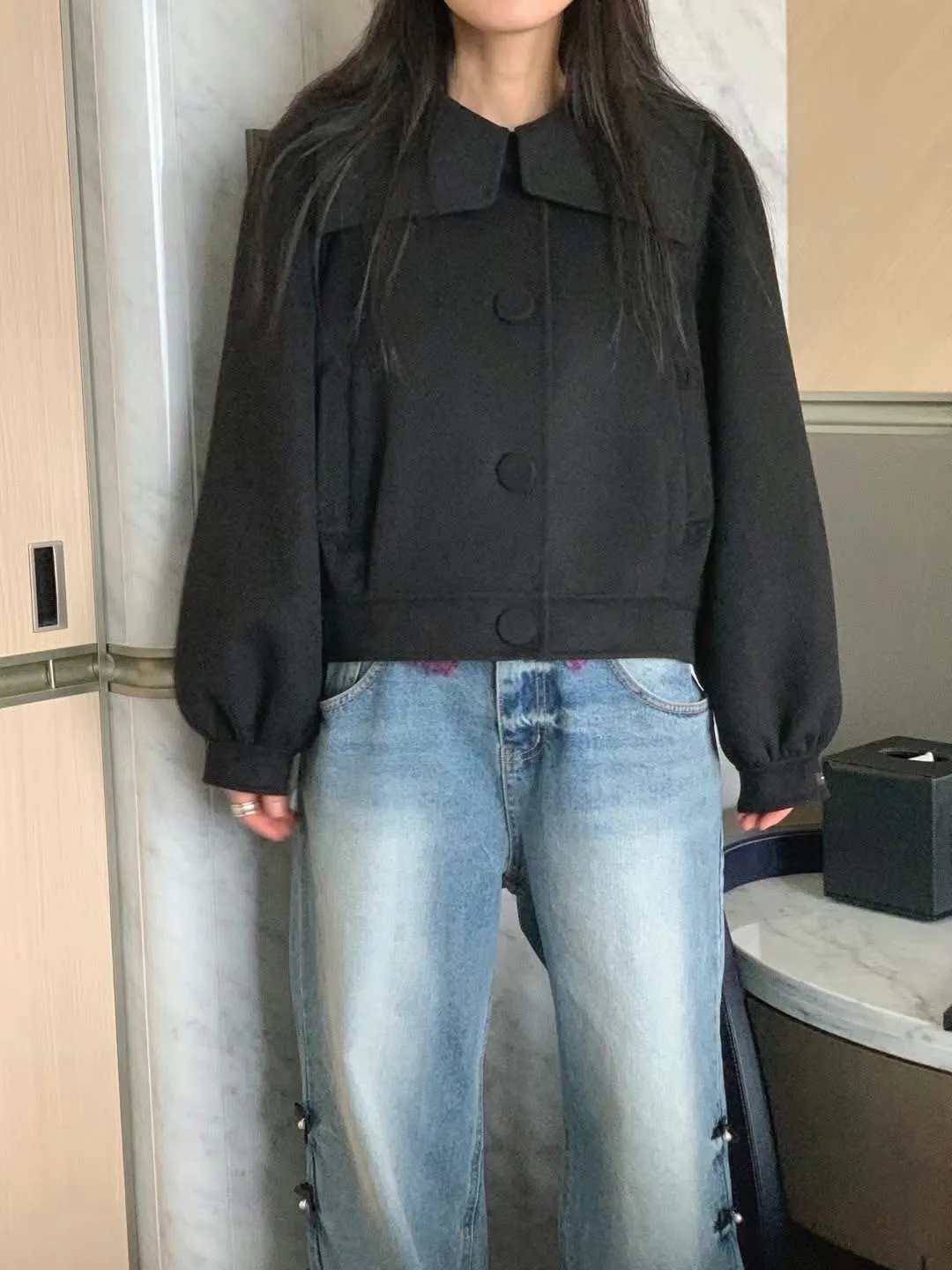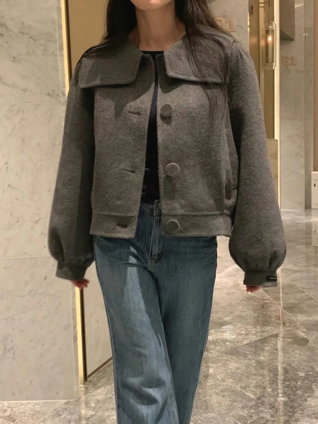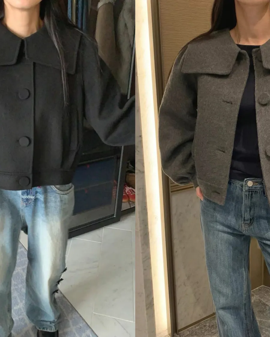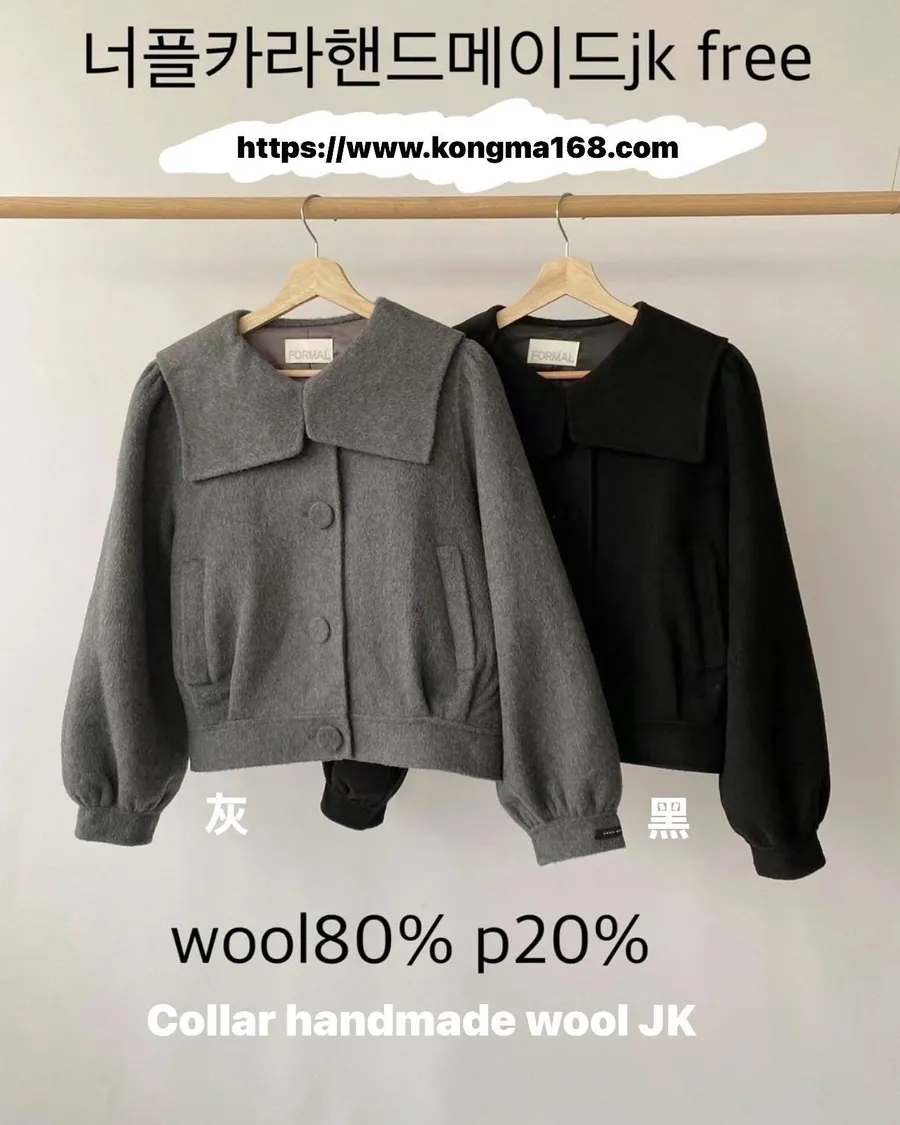 手工羊毛短夾克羊毛80% Polyester 20 %手工羊毛短大衣夾克80 %羊毛材質柔軟輕盈保暖簡約實穿的短大衣翻領造型細節感很棒尺寸(cm): free size小XL以下可以穿胸圍57、衣長54 ㄚˉ