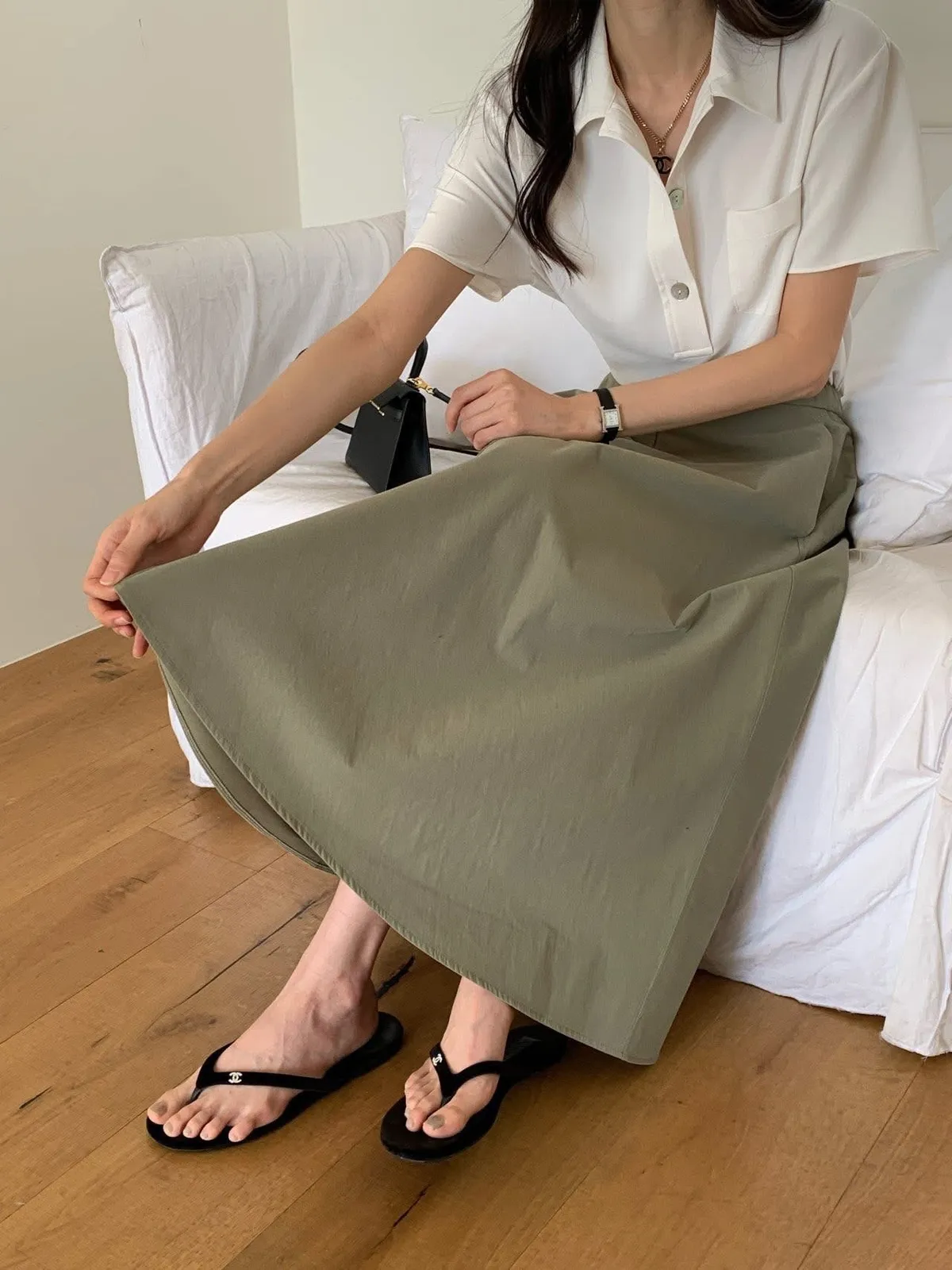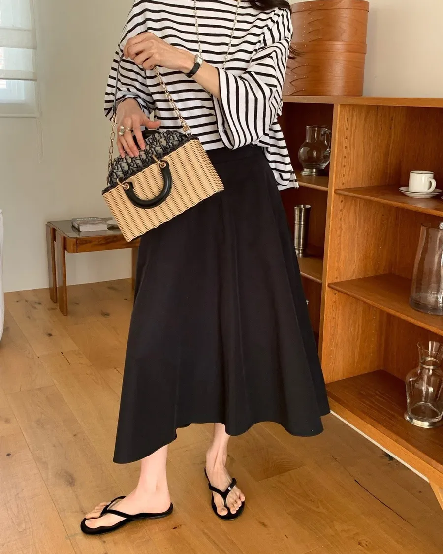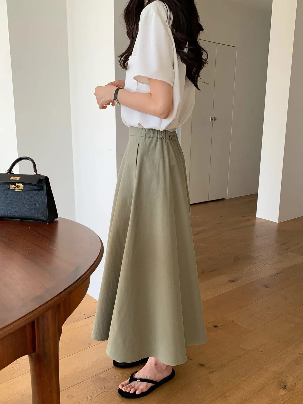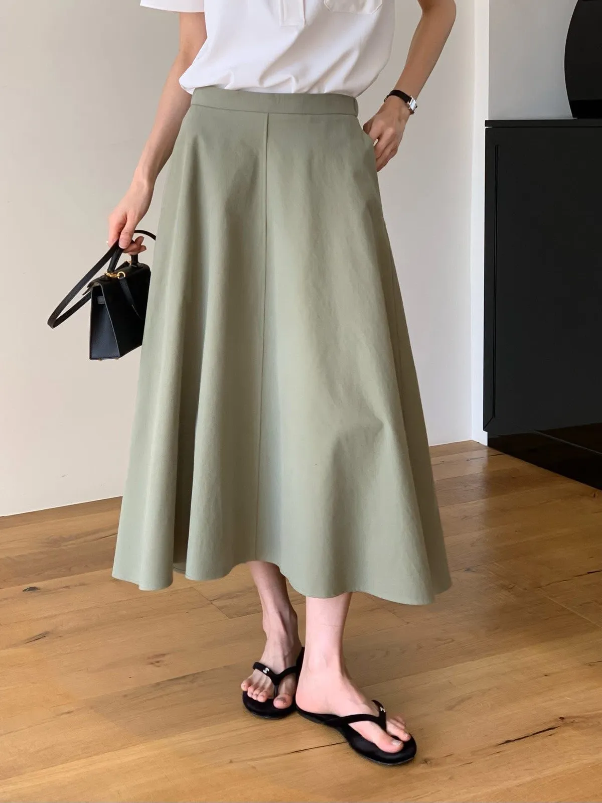 The cash挺版優雅大A Line裙 有口袋簡約優雅A line版型非常優雅美麗的裙子包兩色特價🉐3800尺寸:free size腰圍29後鬆緊、長85公分模特兒為S號160左右身材空媽168 / 70無法😅