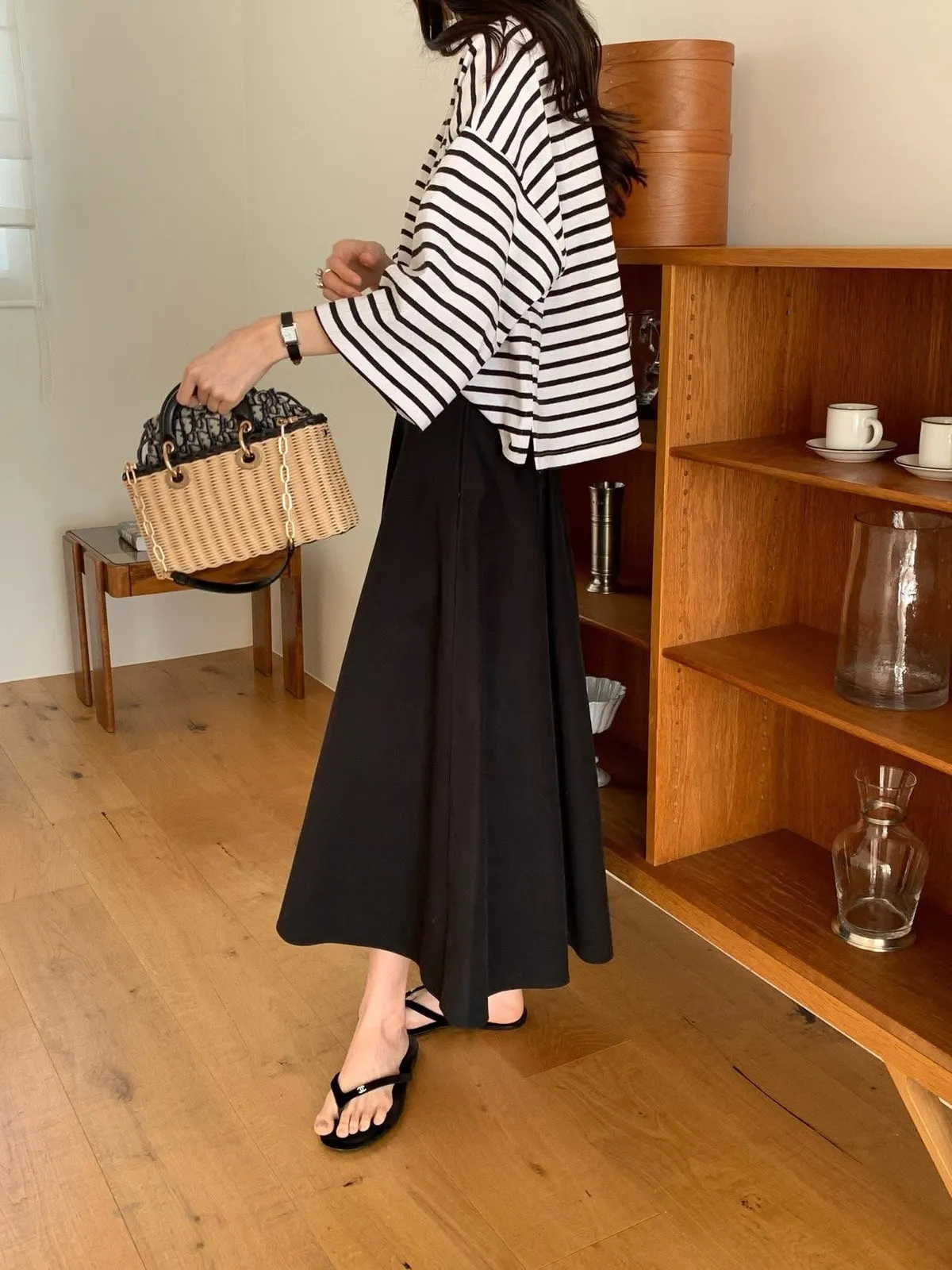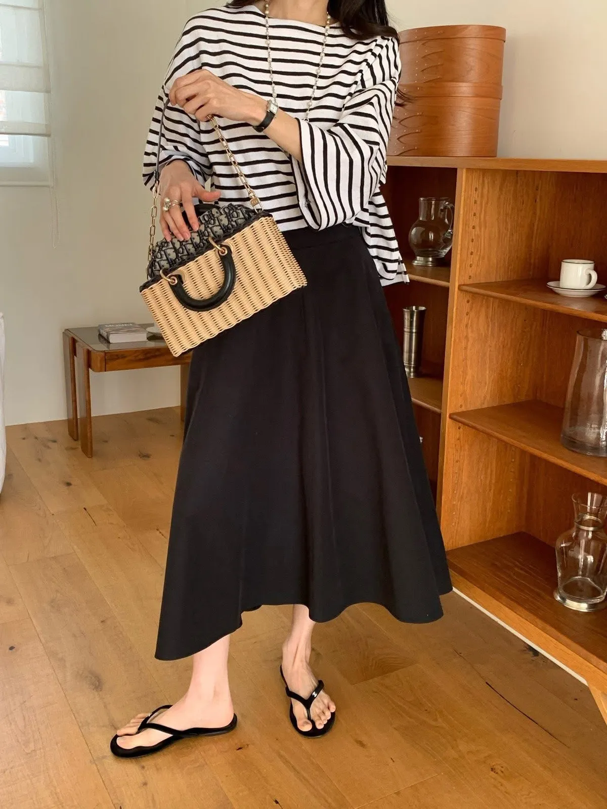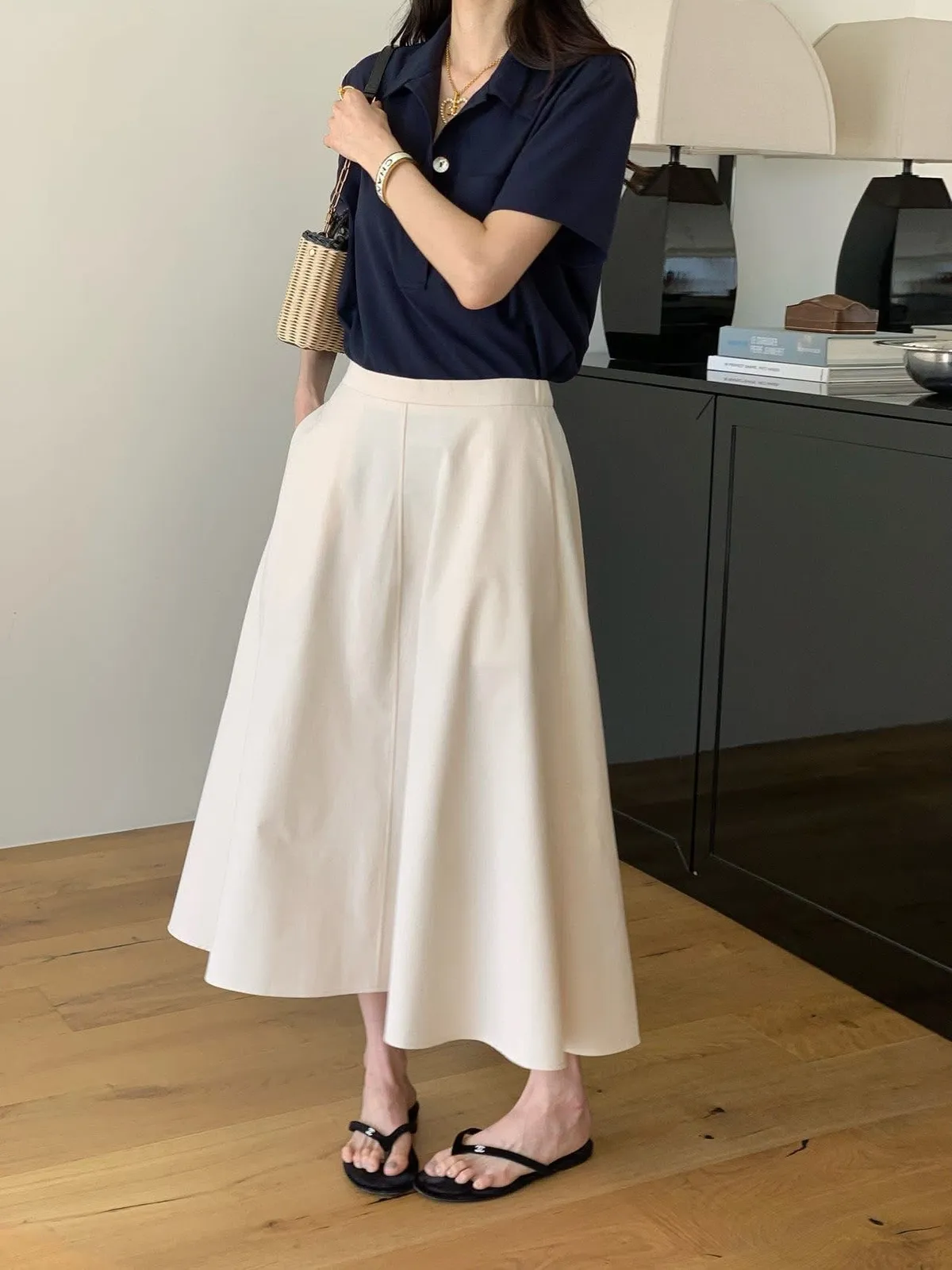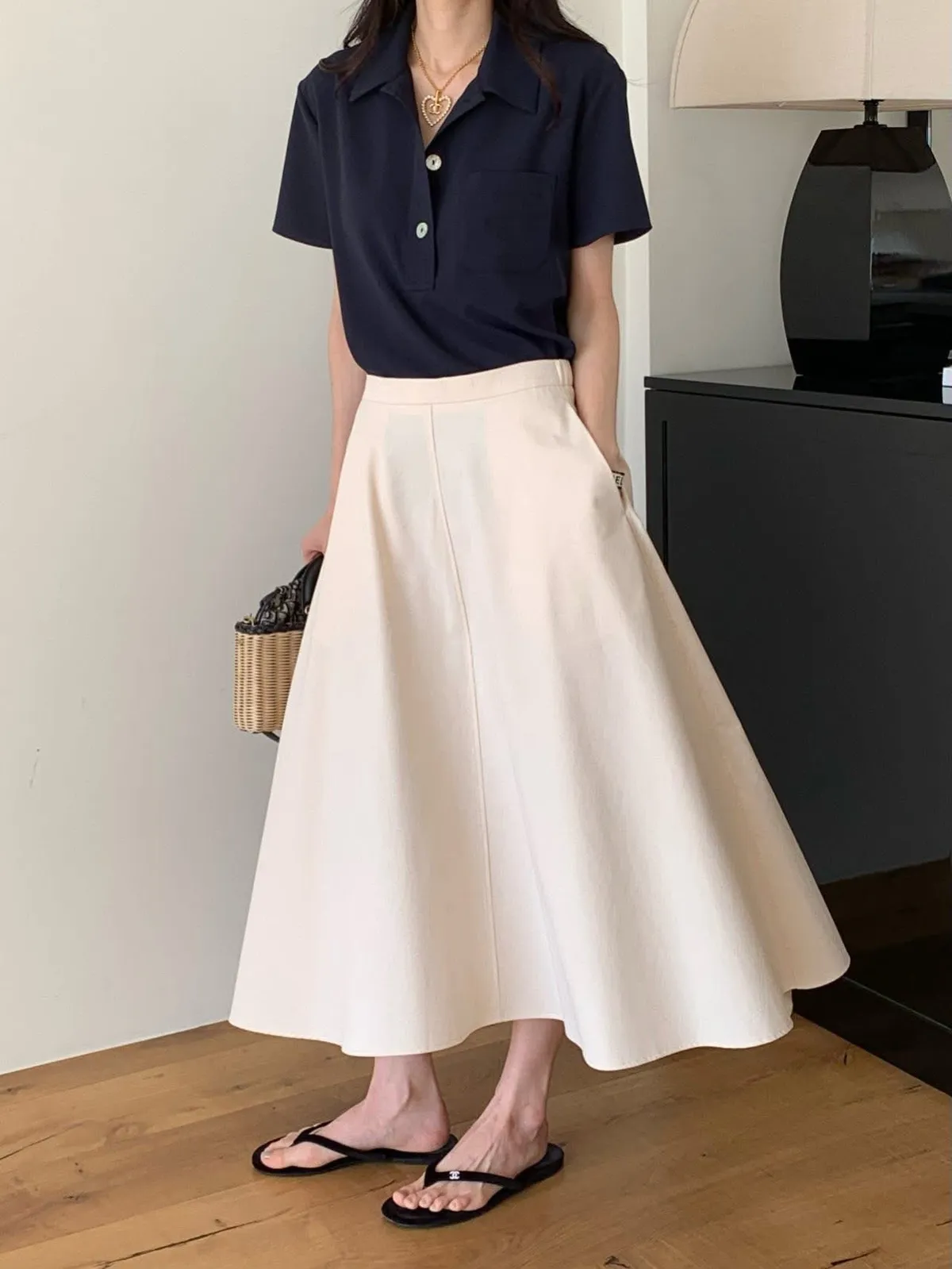 The cash挺版優雅大A Line裙 有口袋簡約優雅A line版型非常優雅美麗的裙子包兩色特價🉐3800尺寸:free size腰圍29後鬆緊、長85公分模特兒為S號160左右身材空媽168 / 70無法😅