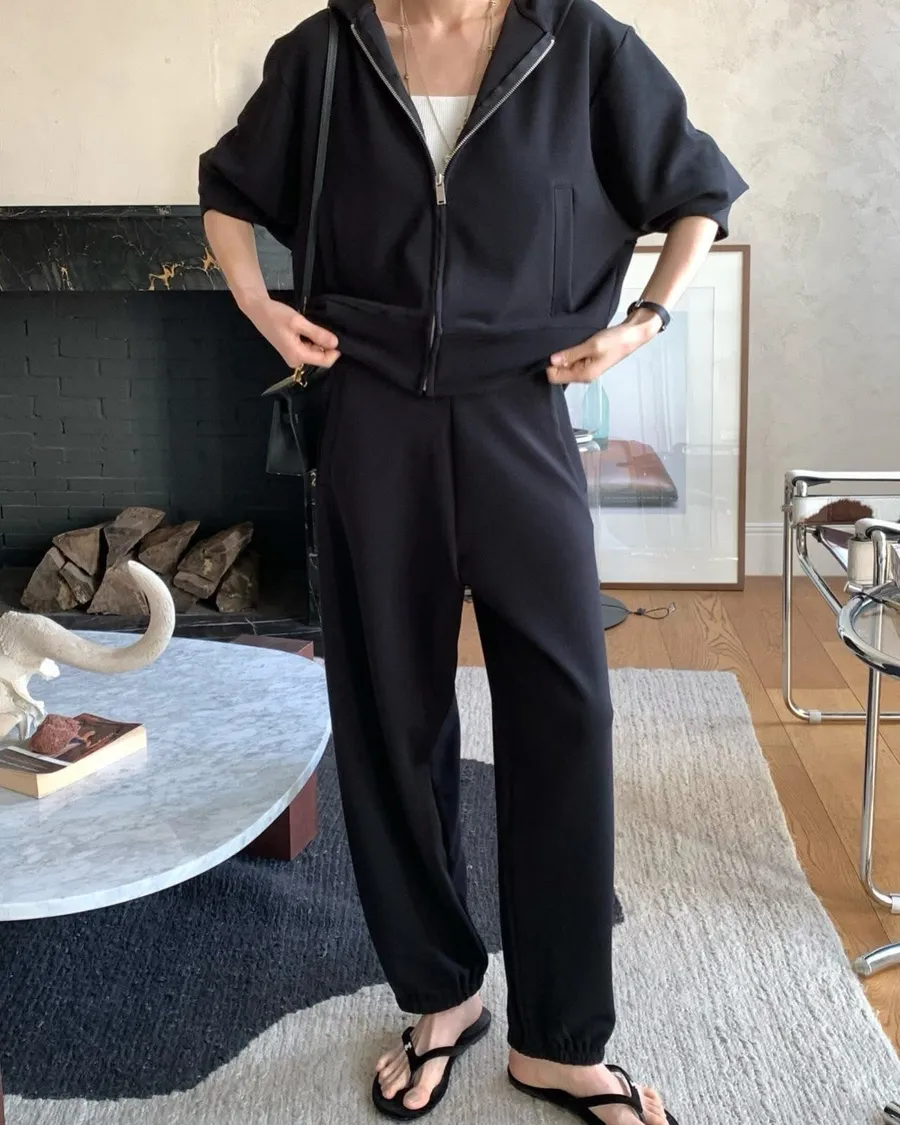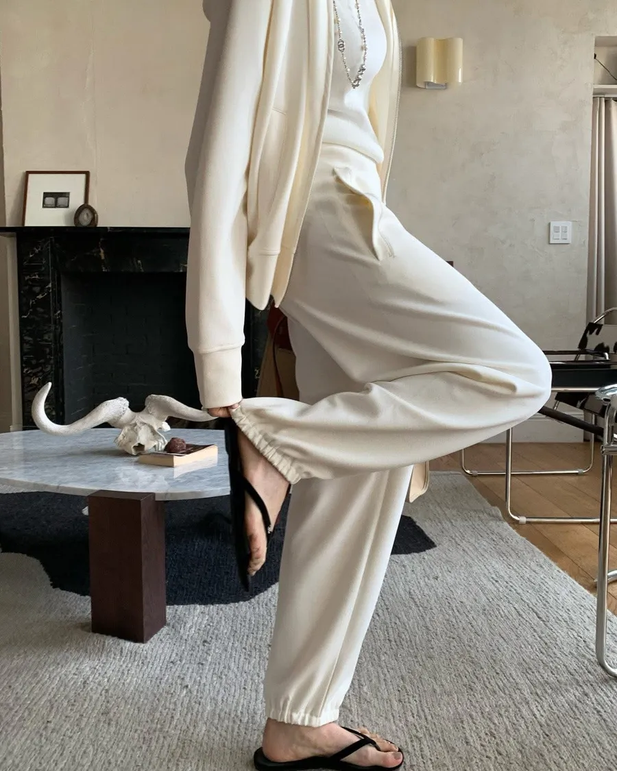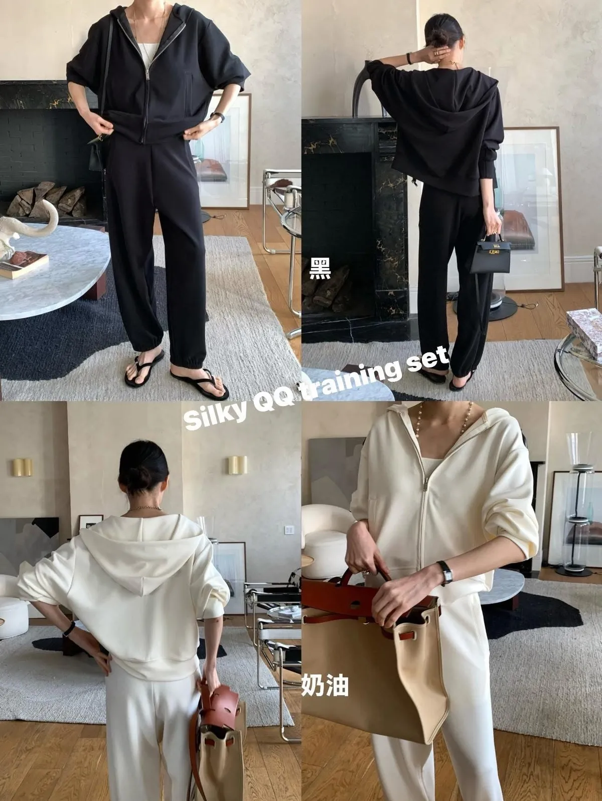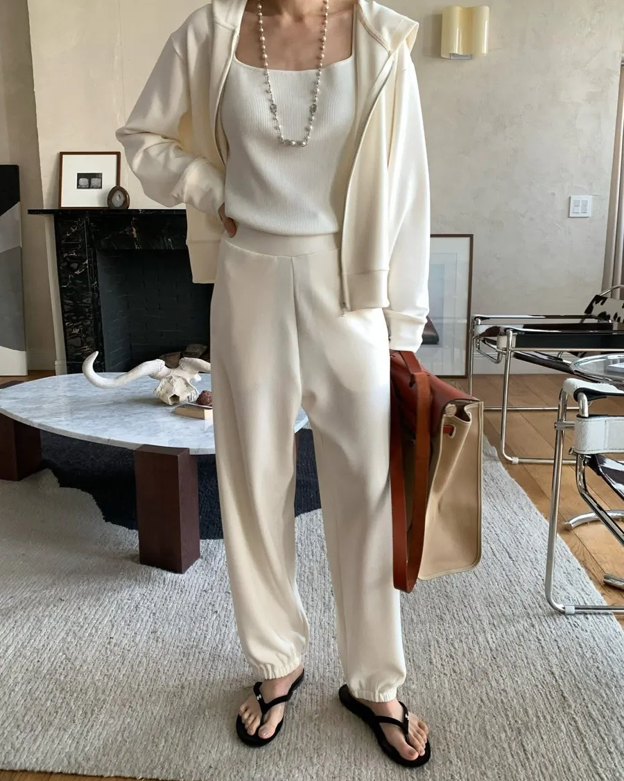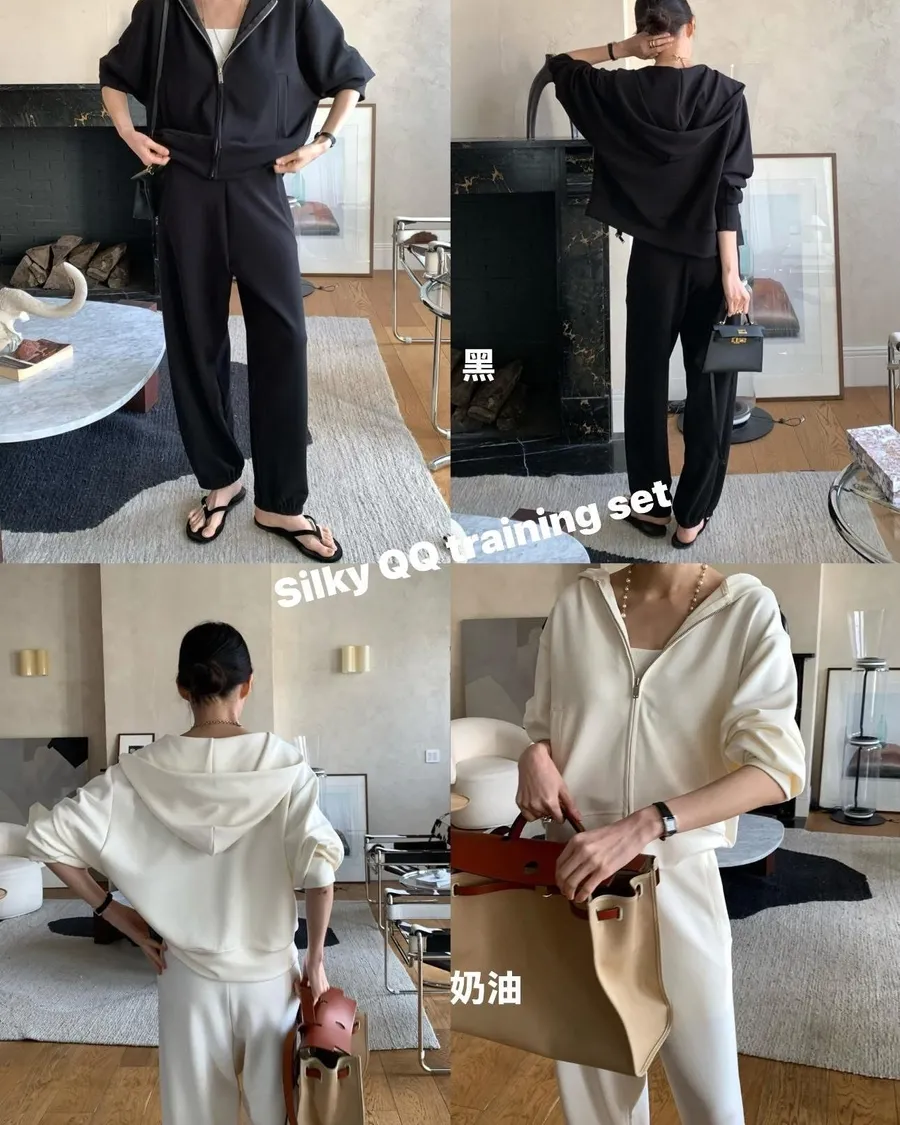Silky QQ training絲感彈性 高質感成套休閒服絲感質感超棒的成套休閒服像絲質一樣滑順、彈性又舒服簡約大方穿起來就很很有氣質尺寸:free sizeS 到L以下都可以上衣:胸圍55、總長56公分褲子:腰圍31、臀49、大腿32、 總長95公分