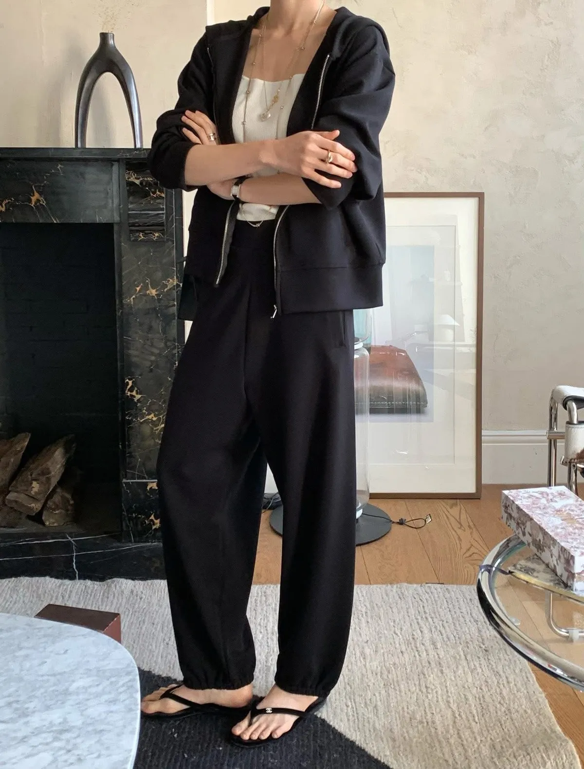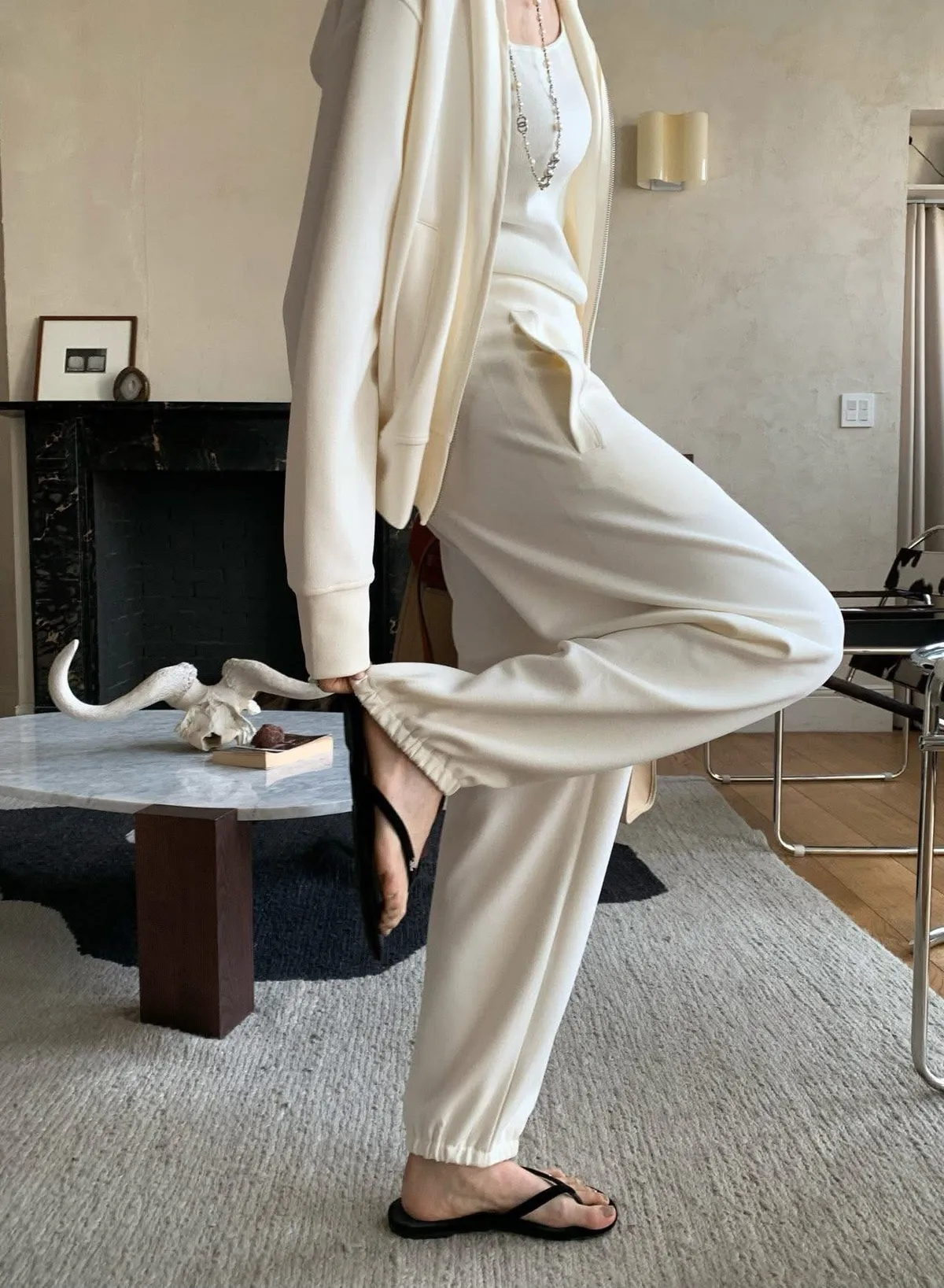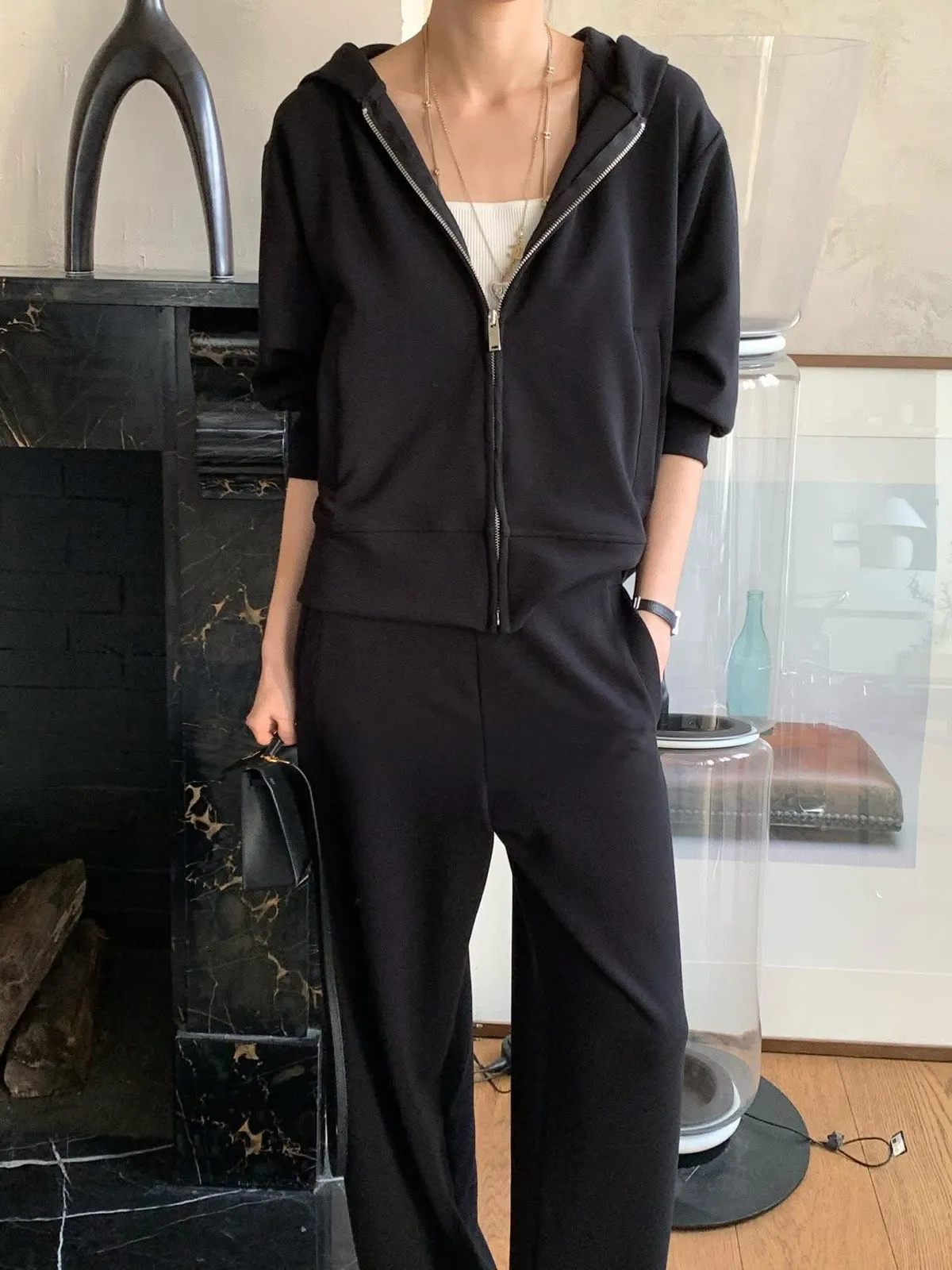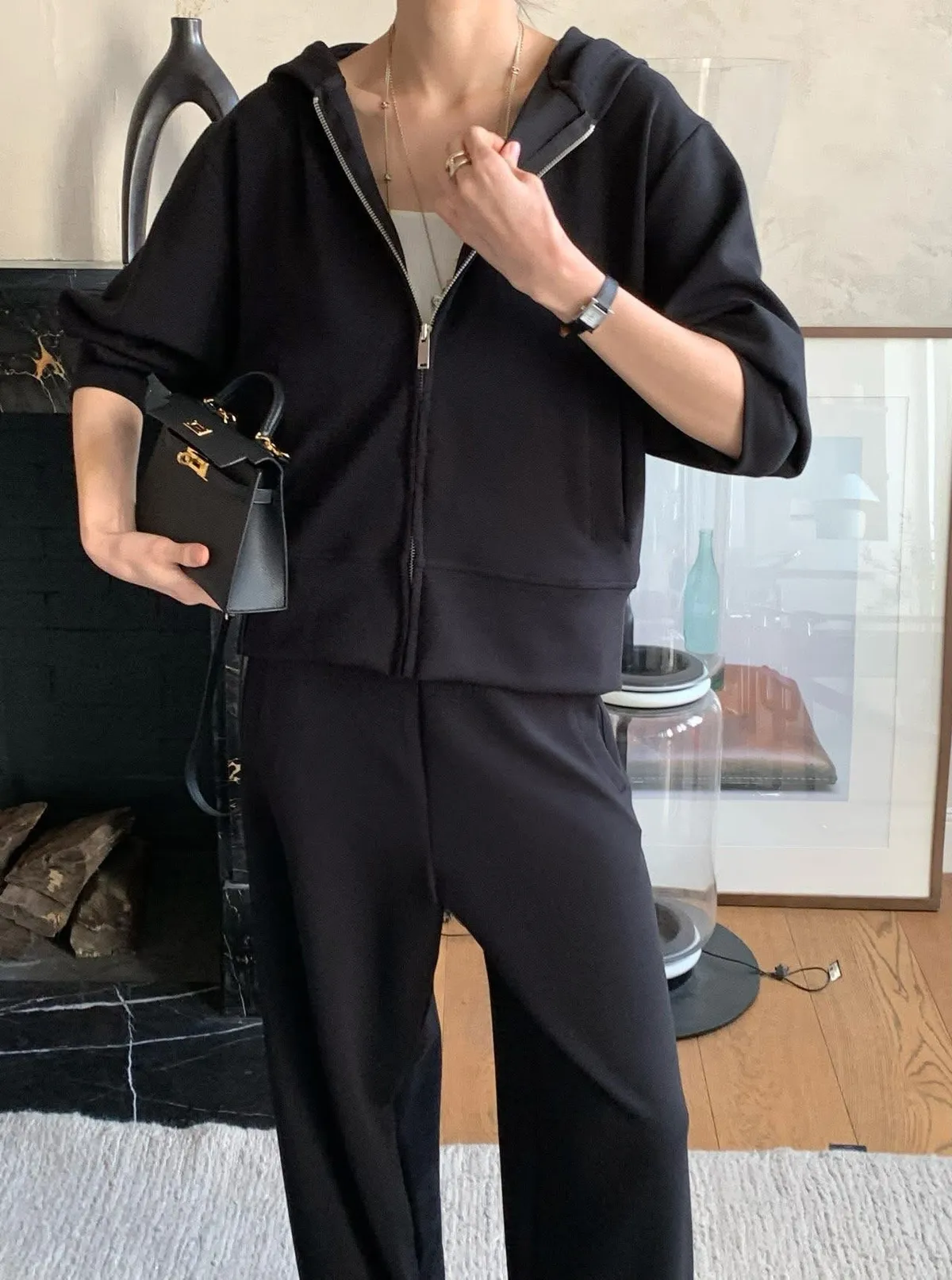 Silky QQ training絲感彈性 高質感成套休閒服絲感質感超棒的成套休閒服像絲質一樣滑順、彈性又舒服簡約大方穿起來就很很有氣質尺寸:free sizeS 到L以下都可以上衣:胸圍55、總長56公分褲子:腰圍31、臀49、大腿32、 總長95公分